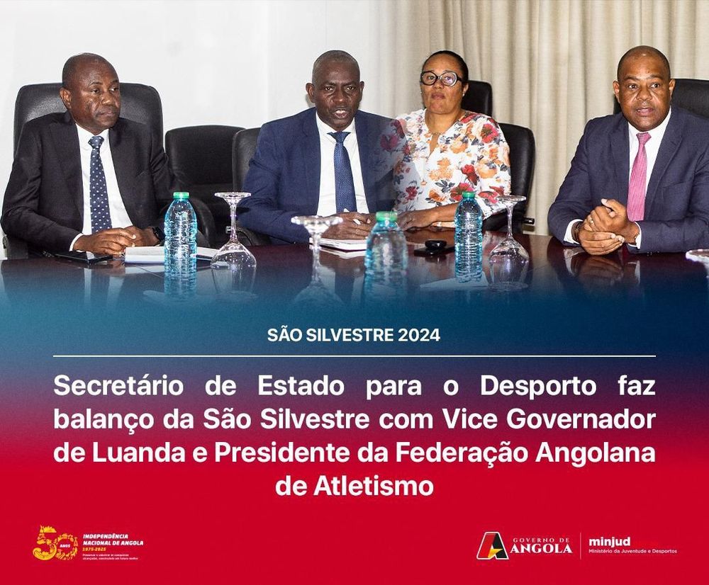 Realizou-se hoje, 9 de Janeiro de 2025, na sede do Ministério da Juventude e Desportos (MINJUD), uma reunião presidida pelo Secretário de Estado para o Desporto, que contou com a participação do Vice-Governador de Luanda e do Presidente da Federação Angolana de Atletismo. Este encontro teve como objectivo avaliar os resultados e a organização da São Silvestre 2024, assim como perspectivar a edição de 2025.